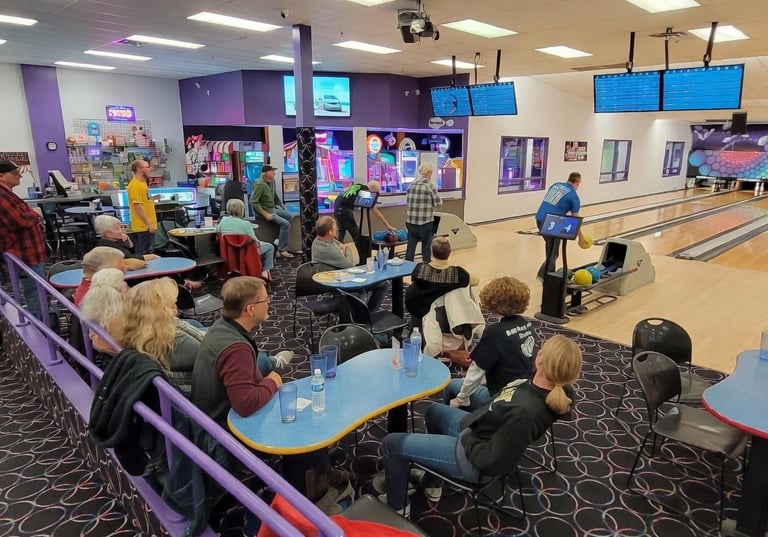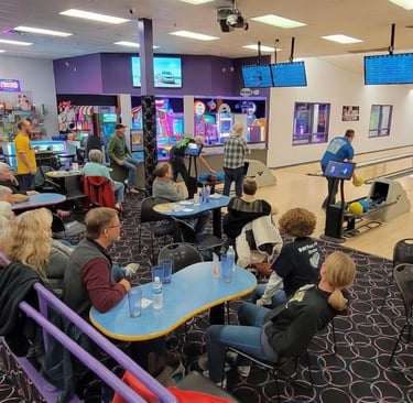 The club gathers each December to enjoy one another's company, reminiscing about the enjoyable times we've had in the past, relishing in pizza, and engaging in a game of bowling.